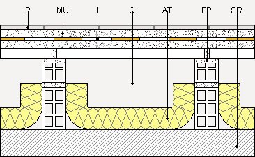 Coberta plana transitable, ventilada, amb enrajolat fix, tipus convencional, pendent del 1% al 5%, per a tràfic de vianants privat, composta de: formació de pendents: tauler ceràmic buit encadellat de 80x25x3,5 cm recolzat sobre envans alleugerats de maó ceràmic buit de 29x14x9 cm, disposats cada 80 cm i amb 30 cm d'altura mitja; aïllament tèrmic: feltre aïllant de llana mineral, segons UNE-EN 13162, revestit per una de les seves cares amb un complex de paper kraft amb polietilè que actua com a barrera de vapor, de 80 mm d'espessor; impermeabilització monocapa adherida: làmina impermeabilitzant flexible tipus EVAC, composta d'una doble fulla de poliolefina termoplàstica amb acetat de vinil etilè, amb ambdues cares revestides de fibres de polièster no teixides, de 0,8 mm d'espessor i 600 g/m², totalment adherida amb adhesiu de ciment millorat C2 E; capa de protecció: rajoles de gres rústic 4/3/-/E, 20x20 cm col·locades en capa fina amb adhesiu de ciment normal, C1 gris, sobre la capa de regularització de morter de ciment, industrial, M-5, rejuntat amb morter de juntes de ciment amb resistència elevada a l'abrasió i absorció d'aigua reduïda, CG2, per junta oberta (entre 3 i 15 mm), amb la mateixa tonalitat de les peces. |